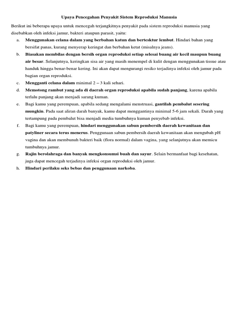 Jika penyakit tersebut tidak segera di obati akan menyebabkan masalah kesuburan baik bagi pria maupun wanita. Penyakit, gejala, penyebab dan upaya pencegahan sistem reproduksi manusia. Bakteri pada mulut mengolah gula, sehingga menghasilkan asam. Menjelaskan upaya pencegahan penyakit pada system. Pcos, untuk mencegahnya biasanya dokter akan menyarankan menjalani gaya hidup sehat dan aktif bergerak sehingga kesehatan sistem reproduksi.